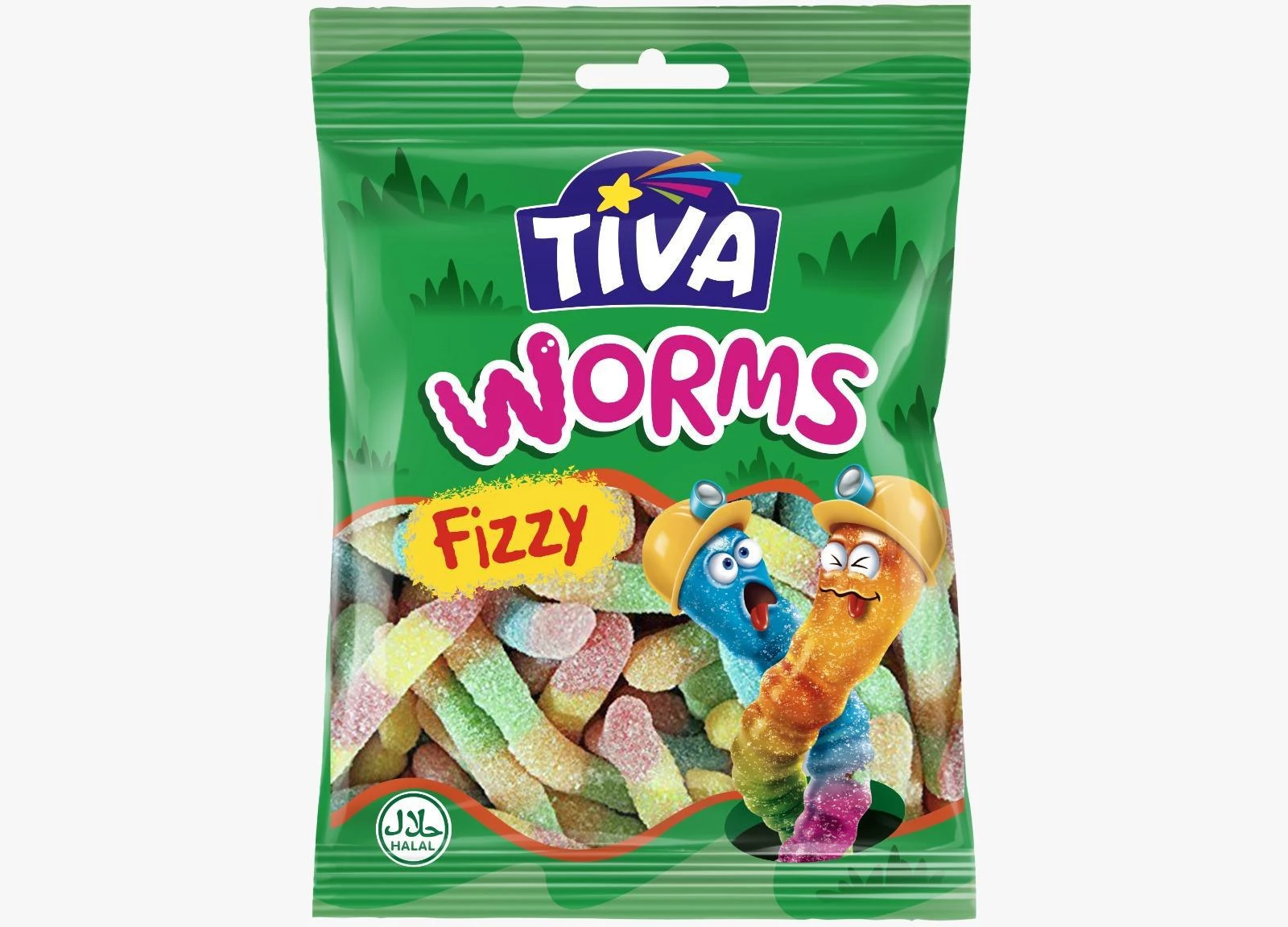 Tiva Fizzy Worms. Soft and chewy gummy worms with fruity flavors and a fizzy sugar coating for a tangy kick, certified Halal. Packed in 80 g bags, perfect for snacking and sharing. Supplied as a case of 6 × 12 × 80 g packs. Store in a cool, dry place; reseal after opening to keep fresh.