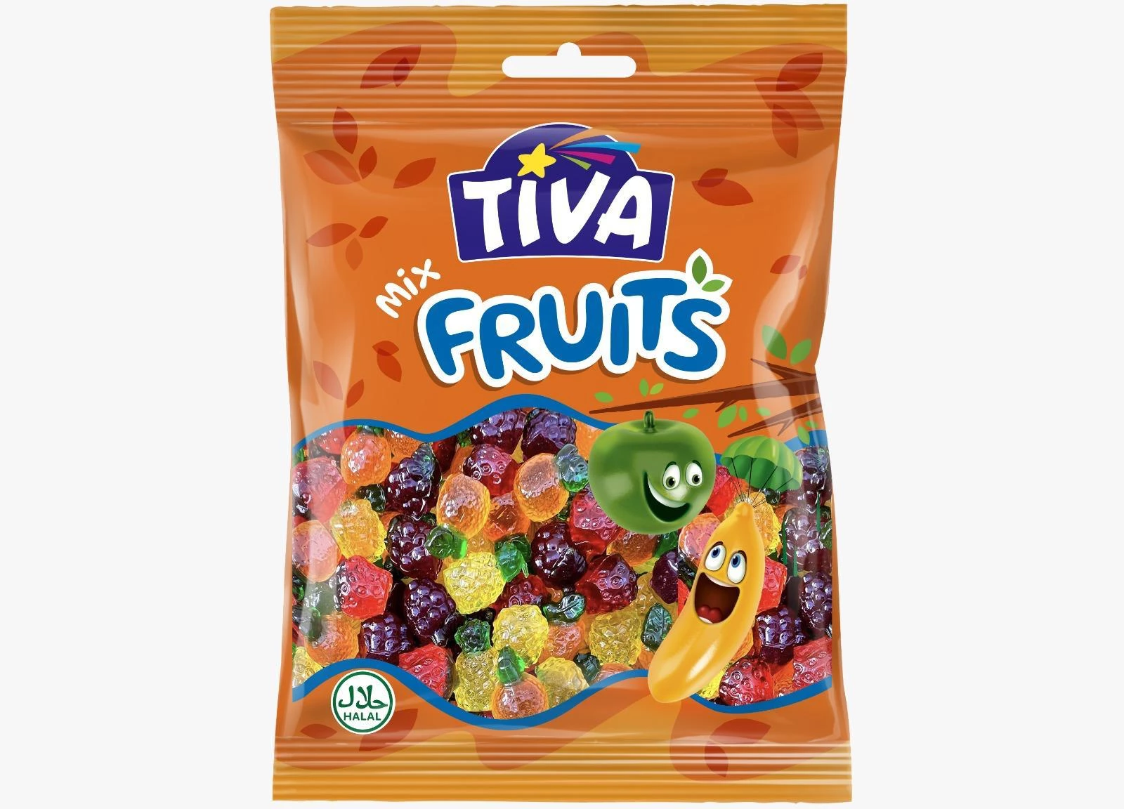 Tiva Mix Fruits. Assorted fruity gummy candies with a soft and chewy texture, certified Halal. Packed in 80 g bags, perfect for snacking, sharing, and kids’ treats. Supplied as a case of 6 × 12 × 80 g packs. Store in a cool, dry place; reseal after opening to keep fresh.